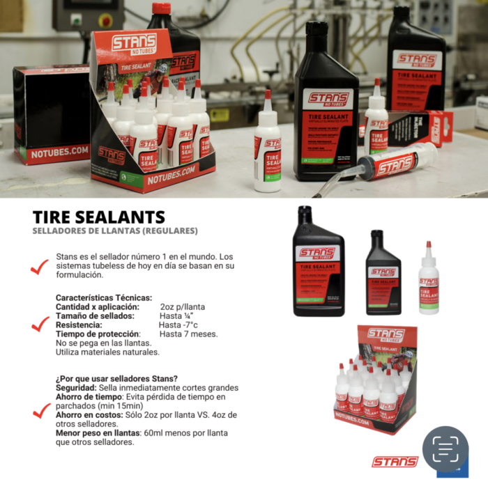 Stan’s Race Sealant se adapta a la más amplia gama de condiciones y temperaturas. El látex premium de baja viscosidad cubre las paredes laterales del neumático para un sellado más rápido. Está compuesto por materiales naturales y seguros para el medio ambiente. Los agentes anticongelantes especiales permiten que el sellador se use en ambientes tan fríos como -30 °C.La durabilidad del sellador en el neumático es de 2 a 6 meses.